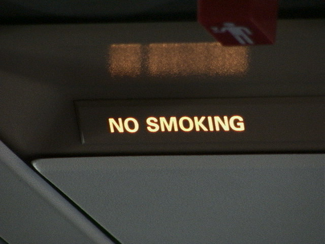 Det er alligevel forbudt at nyde havaneseren hos langt de fleste kommercielle flyselskaber, så "No smoking" skiltet er overflødigt.
