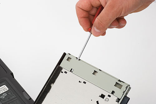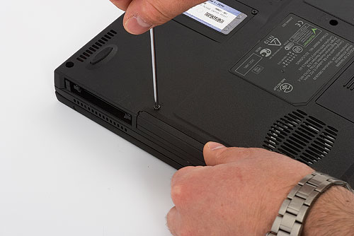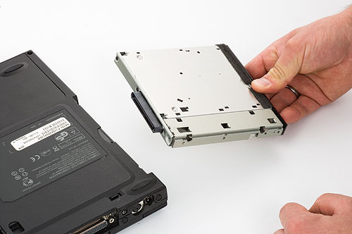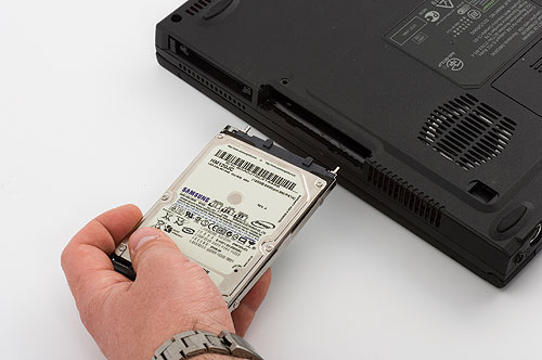 På testmaskinen og mange andre tilsvarende bærbare er der nem adgang til drevet ved at løsne en enkelt skrue og lempe drevet ud. Drevet er typisk monteret på en ramme, hvor det nye drev skal monteres i stedet.