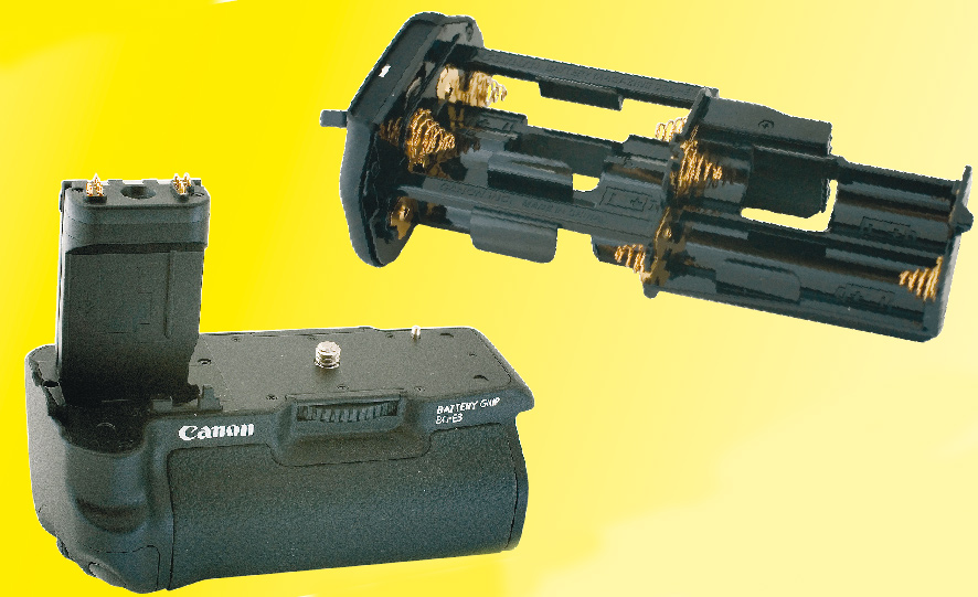 Hvis du har brug for ekstra strøm til kameraet, er batterigrebet løsningen. Det skrues på undersiden af kameraet, hvor det erstatter det genopladelige batteri. I selve batterigrebet er der plads til enten to genopladelige elementer eller seks batterier af AA-typen. Desuden er der en ekstra udløserknap uden på grebet, der er praktisk, når kameraet holdes på højkant. Priseksempel: 850 kroner til Canon EOS 350D.