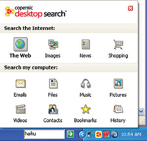 På samme måde som Google Desktop og MSN Search Toolbar kan også Copernic søge i lokale filer og Outlook/Outlook Express e-mail. Du får imidlertid bedre kontrol over dine søgninger, for eksempel kan du specificere e-mail fra en bestemt afsender.