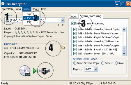 Vi valgte DVD Decrypter, et simpelt, gratis program, som giver gode resultater og mange valgmuligheder. Når du har fortalt programmet, hvor din film ligger (1) , skal du vælge “ifo”-tilstanden (2) og aktivere den såkaldte Stream processing (3).