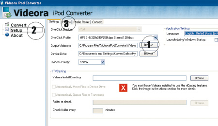 Ipod Video spiller Quicktime-formatet MPEG-4 og MOV og ikke andet. Det betyder, at du skal omkode alle film, der ikke er videopodcasts eller kommer fra Itunes. Du kan omkode film til din Ipod med Quicktime, hvis du køber den fulde version for cirka 300 kroner, men vi anbefaler i stedet, at du bruger Videora Ipod Converter (bemærk, at “Videora” og “Videora Ipod Converter” er to forskellige programmer). Programmet er meget brugervenligt. Vælg Output folder (1) under Setup-menuen (2) – her bestemmer du i hvilken mappe, du vil have dine konverterede film til at ligge. I programmet kan du derefter vælge mellem forskellige profiler (3) , der bestemmer hvordan videofiler skal konverteres. Vi anbefaler, at du eksperimenterer med forskellige profiler, så du kan finde en, der passer til det materiale, du vil konvertere. Du skal dog huske, at du ikke må vælge en bitrate, der overstiger originalfilens bitrate, da der så kan opstå forstyrrelser ved visningen af billedet. Tryk på One-click transcode (4) og vælg den fil, der skal konverteres. Klik på OK og læn dig tilbage. Programmet klarer AVI, MPEG, WMV, Quicktime og VOB. Hent programmet på www.videora.com/en-us/Converter/iPod/