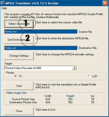Nu skal du angive hvilken fil, der skal konverteres (1), og hvor den nye fil skal placeres (2). Tryk på Start for at starte konverteringen. Når du køber en Archos-afspiller, er program og hjælpefiler ofte gemt i afspillerens hukommelse. Ellers kan det meste hentes fra www.archos.com.