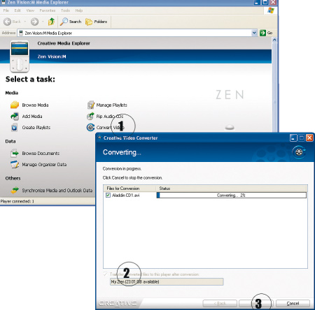 Afspilleren er kendt for at kunne afspille mange forskellige formater, men sommetider er det nødvendigt at konvertere en fil eller to. Tryk på Convert video (1) , klik på Add, og vælg de filer, du vil konvertere. Derefter bestemmer du kvaliteten – du har tre at vælge imellem – og hvor filerne skal placeres. Hvis du vil overføre de konverterede filer til din Vision:M, skal du markere boksen længst nede i programmet (2) . På listen kan du se hvilke filer, det er nødvendigt at konvertere, og hvilke, der vil fungere fra start. Klik på Next (3), og programmet tryller formatet om.