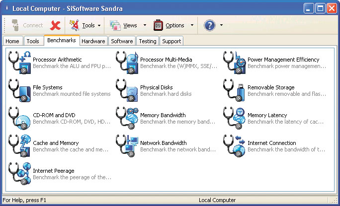 Efter endt installation startes programmet, og man vælger fanebladet Benchmarks for at få en oversigt over mulighederne. Sandra kan måle processoren, filsystemet, de fysiske diske, hukommelsen, netværket og andre elementer, og man kan straks sammenligne sin pc's testresultater med andre computere.