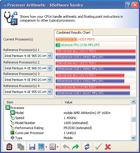 Vil man eksempelvis måle processorens ydelse, dobbeltklikker man på Processor Arithmetic. Målinger for fire andre processorer vises allerede, og man kan vælge mellem en omfattende liste af processorer at sammenligne med.