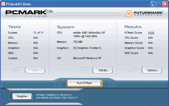 PCmark er hurtigt downloadet og installeret, men det skal med, at PCmark kræver Windows Media Encoder 9 installeret. Det er blot at klikke på Run PCmark-knappen for at starte testen, som består af 11 individuelle test af pc'ens forskellige områder. Til sidst får man et antal point i form af en "score", og det er dette tal, man kan sammenligne med test af andre pc'er.