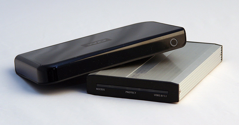Der er tale om to små såkaldte 2,5" diske i eksterne kabinetter. Dermed er der tale om harddiske, som sandsynligvis minder meget om den, som allerede sidder inde i din bærbare pc. Her er de blot blevet udstyret med en ekstern boks og et USB-interface.