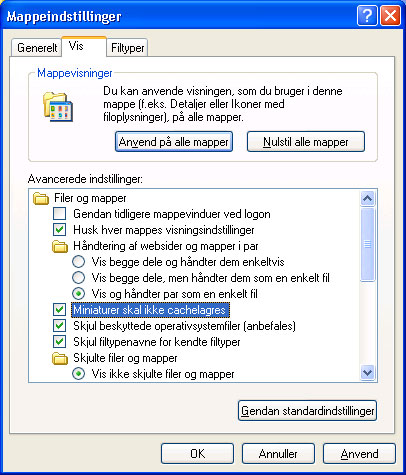 Måden at undgå thumbs.db-filen er at åbne en mappe og vælge Funktioner -> Mappeindstillinger og derefter fanebladet Vis. Marker nu "Miniaturer skal ikke cachelagres", og klik på OK.