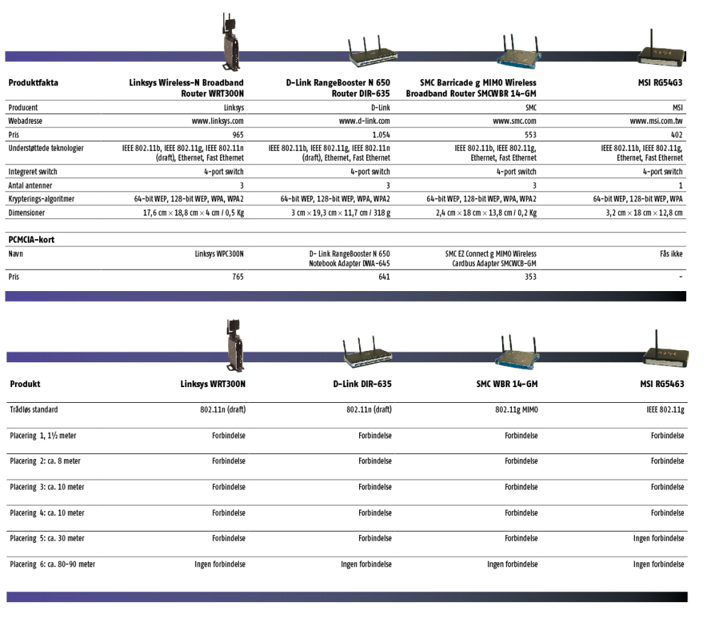 Vi har både testet den klassiske 802.11b/g-standard, overbygningen på denne, der kaldes MIMO, og sidst, men ikke mindst, har vi haft fat i to af de nyeste produkter, der kører på udkastet til n-standarden, draft N.