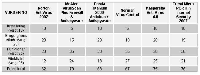 Hvis der skal siges noget overordnet om testen, må det være, at intet er vigtigere end programmernes effektivitet. Det indebærer en måling af, hvor hurtige programmerne er, og hvor gode de historisk set har været gennem årene til at finde samtlige kendte vira. Det sidste testes flere gange årligt af Virus 100% Bulletin Awards, og hastigheden af den enkelte virusscanner er blevet målt på en moderne pc med Windows XP Service Pack 2.