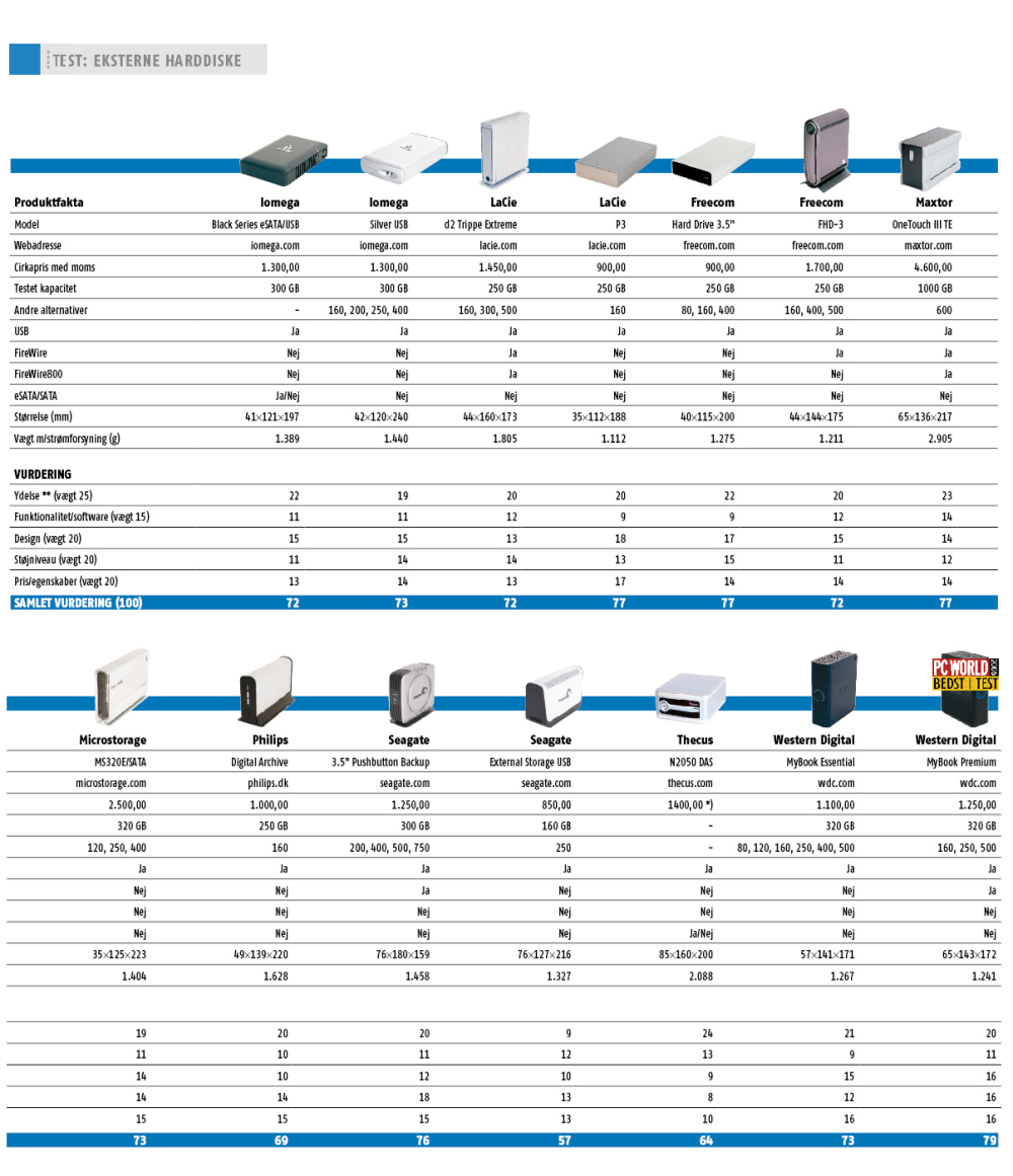 I denne test er ikke alle produkterne direkte sammenlignelige – der er for eksempel en almindelig, enkel USB-harddisk på 250 GB overfor løsninger med to harddiske og hurtigere interface til en pris, der er fire-fem gange højere.