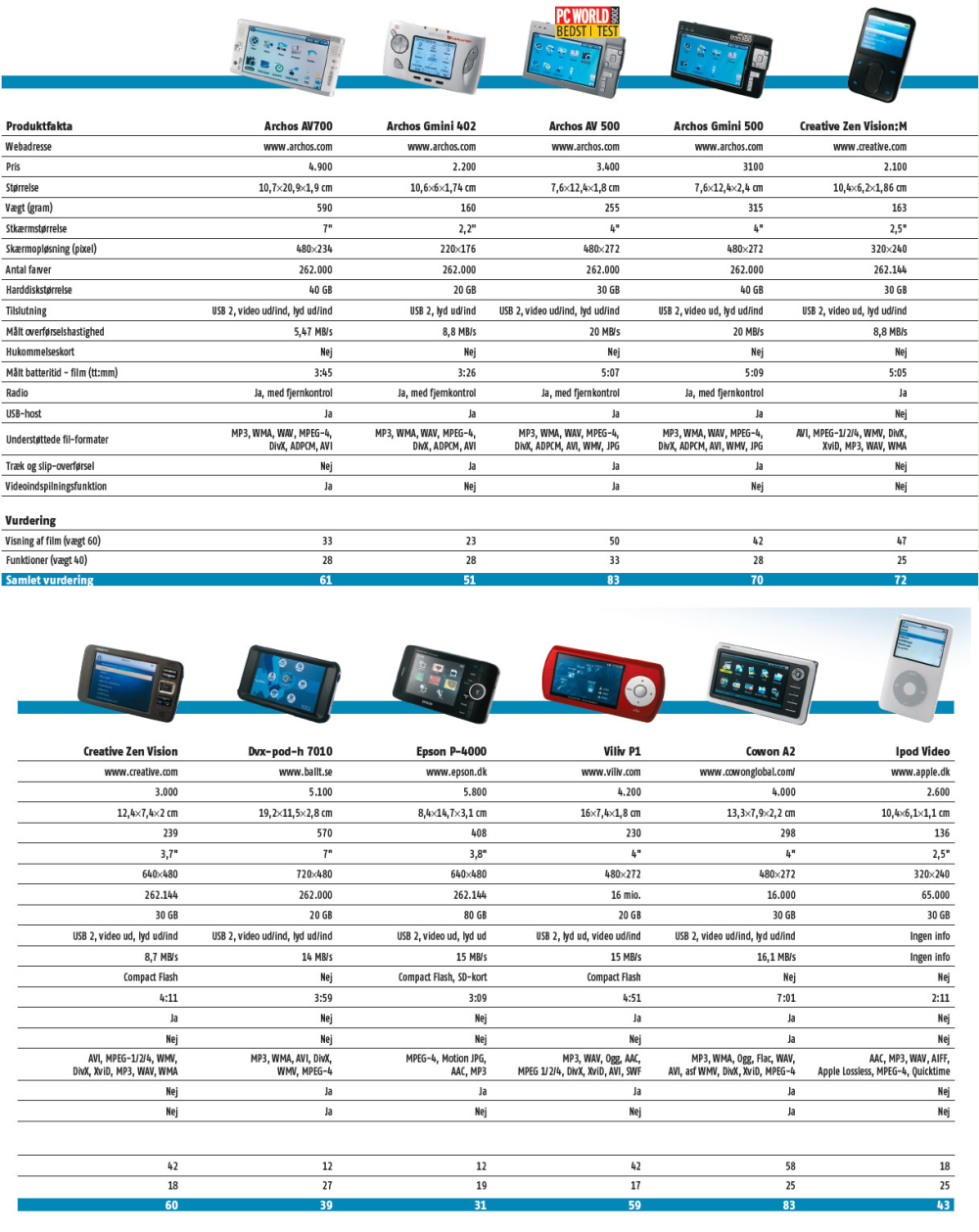 Det er stadig franske Archos, der dominerer markedet med sin omfattende præstation og modelprogram. Producentens flagskib, AV 700, er desværre en skuffelse. Derimod bør du se nærmere på den mere beskedne model AV 500, nok en af markedets bedste bærbare videoafspillere. Den har alt, hvad du kan forvente, uden at være fantastisk til noget specielt. Vi venter stadig på den ultimative lommevideoafspiller.