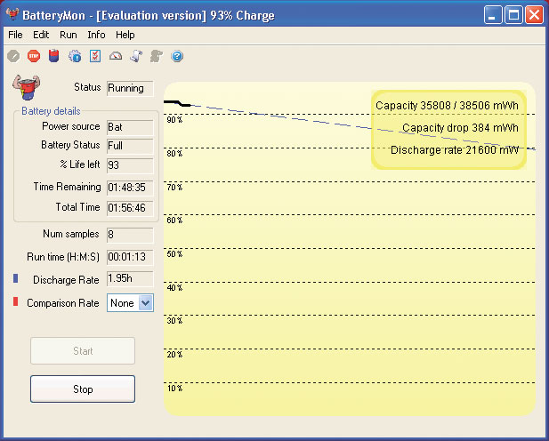 BatteryMon kan oplyse om alle batteriets tekniske detaljer, men vigtigere er det, at man på en graf kan se, hvor meget strøm, man har tilbage, og hvor hurtigt strømmen aftager. Denne graf kan især være et vigtigt værktøj, når man udarbejder sin strømstrategi: Jo mere hardware, man slår fra, og jo mindre, man belaster sin bærbare, desto langsommere tømmes batteriet, og det kan aflæses på BatteryMons graf.