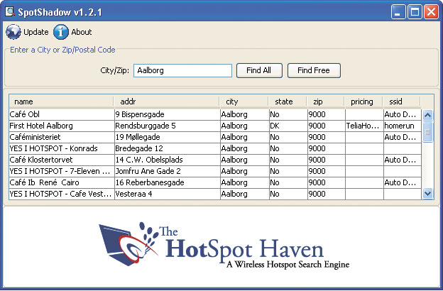 HotSpot Haven er en af nettets største online databaser over hotspots, og fra websiden kan man også downloade ShadowSpot, som er en simpel database med 55.000 hotspots over hele verden. Det vil sige, at man kan finde hotspots i Berlin, Aalborg eller New York, selv om man ikke er online. Det er både simpelt og smart.