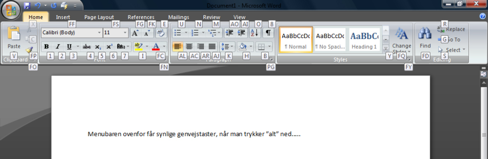 Trykker man en gang på Alt-tasten, får man mulighed for at vælge hvilken menubar man vil se. Når man har valgt sin menubar, får alle ikoner på værktøjslinien et lille bogstav ud for sig, og dermed kan man meget hurtigt og nemt navigere rundt i Word med tastaturet og spare mange museklik.