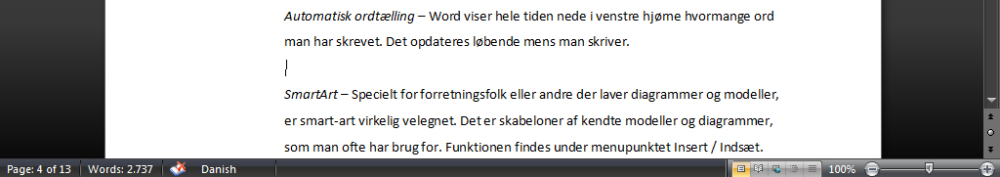 Automatisk ordtælling – Word viser hele tiden nede i venstre hjørne hvor mange ord man har skrevet. Det opdateres løbende, mens man skriver. Rigtigt rart for studerende og travle journalister med begrænset plads.