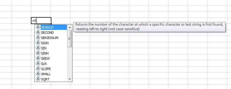 Når man skriver "=S" foreslår Excel straks mere end 30 formler, der starter med S. Så kan man nemt vælge den formel, man skal bruge.