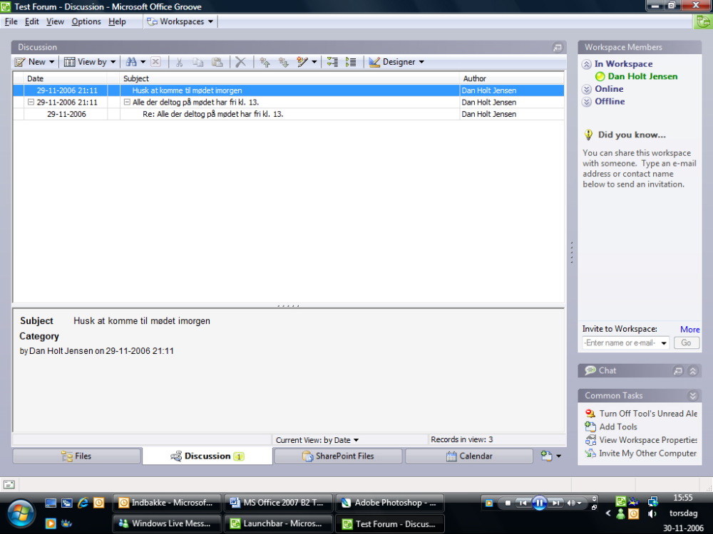 Groove er et program som Microsoft har opkøbt og inkluderet i deres Office 2007 pakke. Vores test er meget overfladisk, da det er et program med mange muligheder.