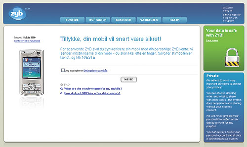 6. SYNKRONISERING MED ZYB Du skal nu have fat i din mobiltelefon. Zyb sender automatisk en særlig SMS-besked til din telefon, som indeholder opsætningen. Når du får denne SMS, skal du på mobilen åbne beskeden. Inden da klikker du på linket og kommer videre. Nogle telefoner kræver, at man herefter indtaster en PIN-kode. Normalt er den 1234. Når man har indtastet PIN-koden, skal man vælge at gemme indstillingerne på mobilen. Herefter klikker man på linket i browseren for at komme videre. Når indstillingerne er gemt, er man faktisk klar til at synkronisere sin telefon med Zyb. På skærmen er en kort vejledning. I vores test har vi anvendt en Nokia N80, der benytter Nokias nyeste Series 60 version 3 som styresystem. Her går man ind i menuen Forbindelser, vælger Synk. I listen vælges ZYB Sync og her vælges Synkroniser. Herefter beder telefonen om, at man vælger forbindelse. Er telefonen sat rigtigt op til GPRS, EDGE eller 3G, bør man blot kunne vælge den rigtige forbindelse, eksempelvis TDC Mobil WAP GPRS, hvis du har TDC som udbyder. Nu går telefonen i gang med at synkronisere med Zybs server. Alt efter hvor mange aftaler og kontakter, man har, samt ikke mindst hvilken type forbindelse, man benytter, tager det lidt tid. I vores test synkroniserede vi 172 kontakter over en 3G-forbindelse, og det tog lidt over 1½ minut. Når synkroniseringen er færdig, fortæller telefonen det. Og så har du faktisk taget en backup af din telefon.