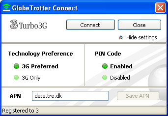 Selve softwaren kunne ikke være lettere. Alt hvad du behøver kan stå i en enkelt vindue på skærmen, og du skal kun tage stilling til, om du vil tilslutte eller frakoble forbindelsen, og om du vil beskytte din forbindelse med PIN-kode. Det sidste er nok en god idé, specielt når man husker, hvor mange bærbare der hvert år glemmes i Københavns Lufthavn.
