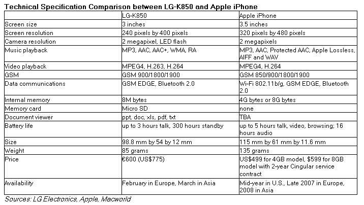 Da LG's Prada-mobil og Apples iPhone ligner hinanden til forveksling, bringer vi her en sammenligning af specifikationerne for de to telefoner. Klik på tabellen for at se den i et større format.