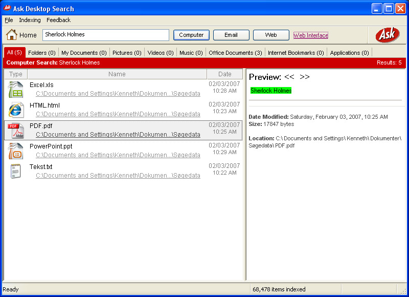 Siden Ask Desktop Search ikke har indbygget værktøjer til at begrænse søgningen, ender man hurtigt med et uoverskueligt søgeresultat, der inkluderer tonsvis af digitalfotos, iTunes-musik, og hvad man ellers måtte have på harddisken.