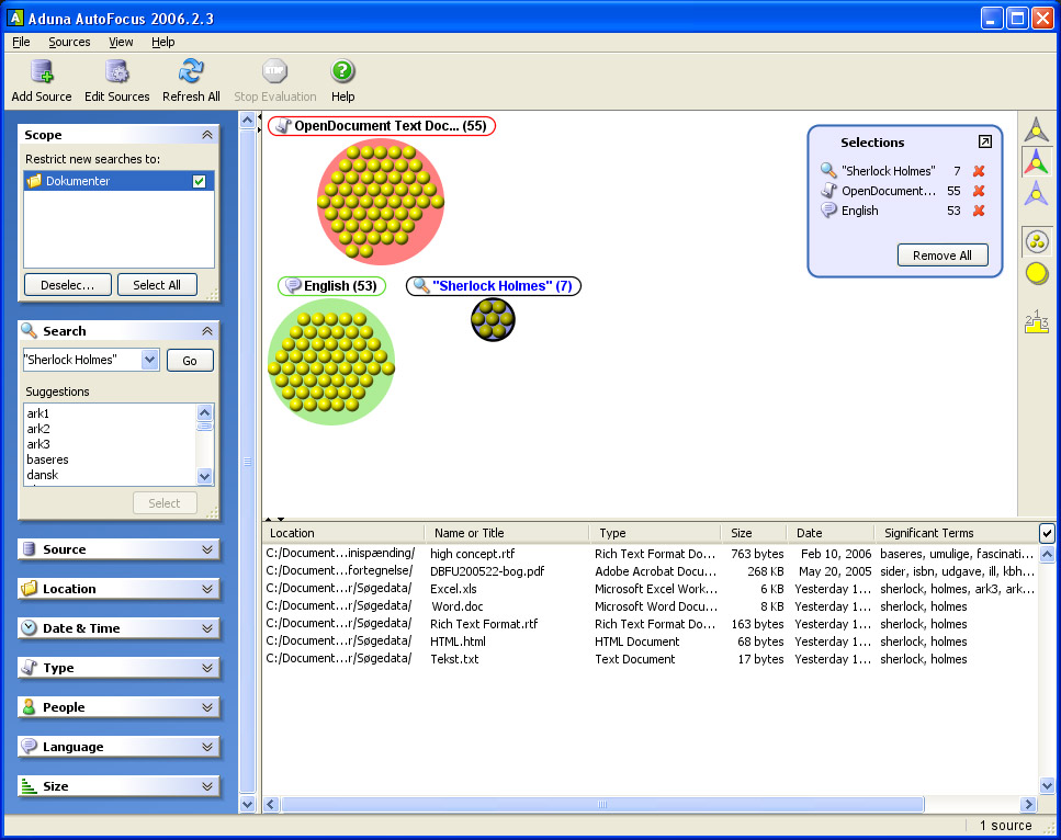 Når det gælder søgning, ser Autofocus mere lovende ud. Hver søgning vises som en cirkel med små bolde i, så man får en meget visuel fremstilling af sit søgeresultet. Et enkelt klik på cirklen viser en liste over de fundne dokumenter i bunden af skærmbilledet.