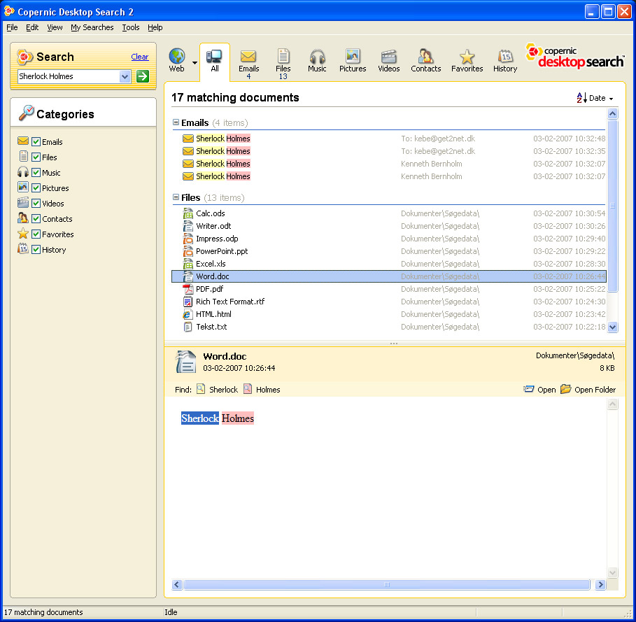 Det virker indledningsvis lidt begrænset, men bare vent - der er godt nyt om lidt. Copernic Desktop Search indekserer også e-mail gemt i både Outlook Express og Thunderbird, og den eneste af de testede dokumenttyper, der blev sprunget over, var ZIP-filer.