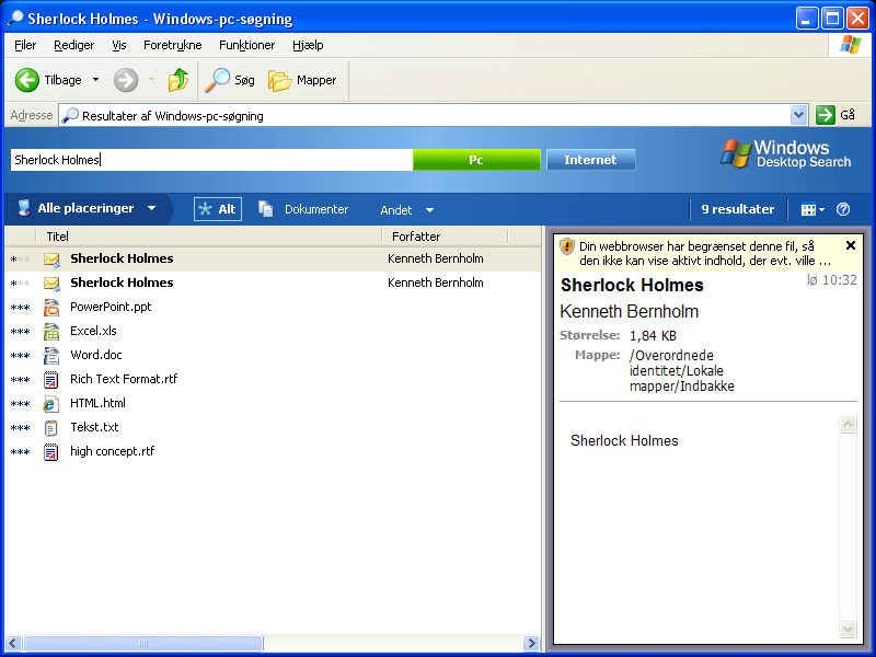 Man skulle ikke tro, at et Microsoft-program ville kunne kigge ind i OpenOffice-dokumenter, men ikke desto mindre så det ud til at være tilfældet. I hvert fald har Windows pc-søgning registreret søgefiltre til indeksering af OpenDocument-filer, men programmet finder desværre ikke OpenOffice-dokumenterne med "Sherlock Holmes".