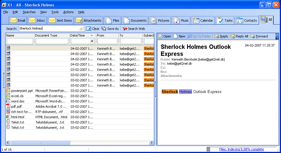 Den er godt nok 100 år og en eftermiddag om at indeksere harddisken, og den kan ikke læse OpenOffice-dokumenter, men den kan alt andet inklusive indeksere e-mail i zippede filer og i både Outlook Express og Thunderbird. Med X1 følger desuden også en speciel toolbar til Microsoft Outlook, hvis man har det installeret.