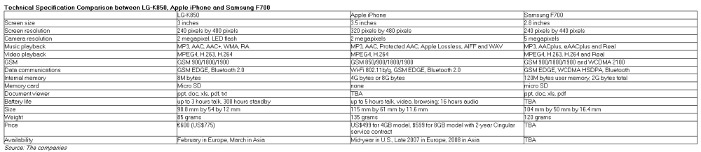 Her finder du et skema med en oversigt over specifikationerne for de tre nye touchscreen mobiltelefoner fra LG, Apple og Samsung.
