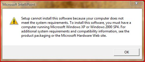 Klikker du trods denne velmente advarsel videre, får du efterfølgende besked om, at installationen ikke kan fortsætte, da computeren ikke opfylder systemkravene. Musenes software kan nemlig kun installeres på Windows XP.