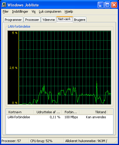 Joost oplyser, at programmet downloader cirka 320 megabyte i timen, hvilket giver godt 700 Kbit/s - altså ikke noget, der skulle volde testmaskinens to megabit ADSL problemer. Windows netværksmåling bekræftede da også dette, idet kun omtrent 0,10 procent af pc'ens 100 Mbit Ethernet-interface blev udnyttet. Et kig på cpu-bruget afslørede derimod, at den mellemstore 64 bit cpu ofte ramte loftet med 100 procent, hvilket selvfølgelig er lidt vanvittigt for at se streaming video.