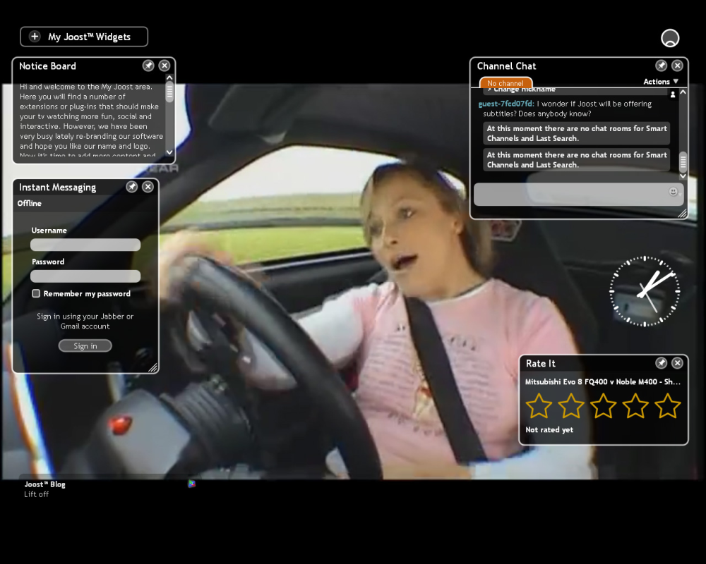 Joost er gratis tv-udsendelser og film leveret i noget nær fuldskærmskvalitet direkte til pc'en. Man installerer bare et lækkert lille program, som giver nem adgang til et stort peer-2-peer-netværk fyldt med video. Og der er ikke tale om små klip med copyrightproblemer, som man ser det hos YouTube, men derimod hele udsendelser fra blandt andre National Geographic og MTV. Blev det nævnt, at det er gratis?