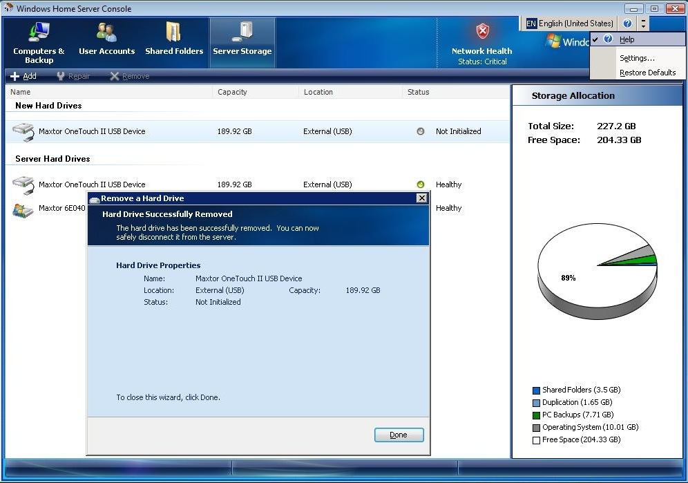Det gør man ganske enkelt ved at højreklikke på drevets ikon og bede serveren om at frakoble enheden. Så flytter serveren automatisk alle data over på de øvrige drev og giver herefter besked om, at vi kan fjerne den pensionerede harddisk.