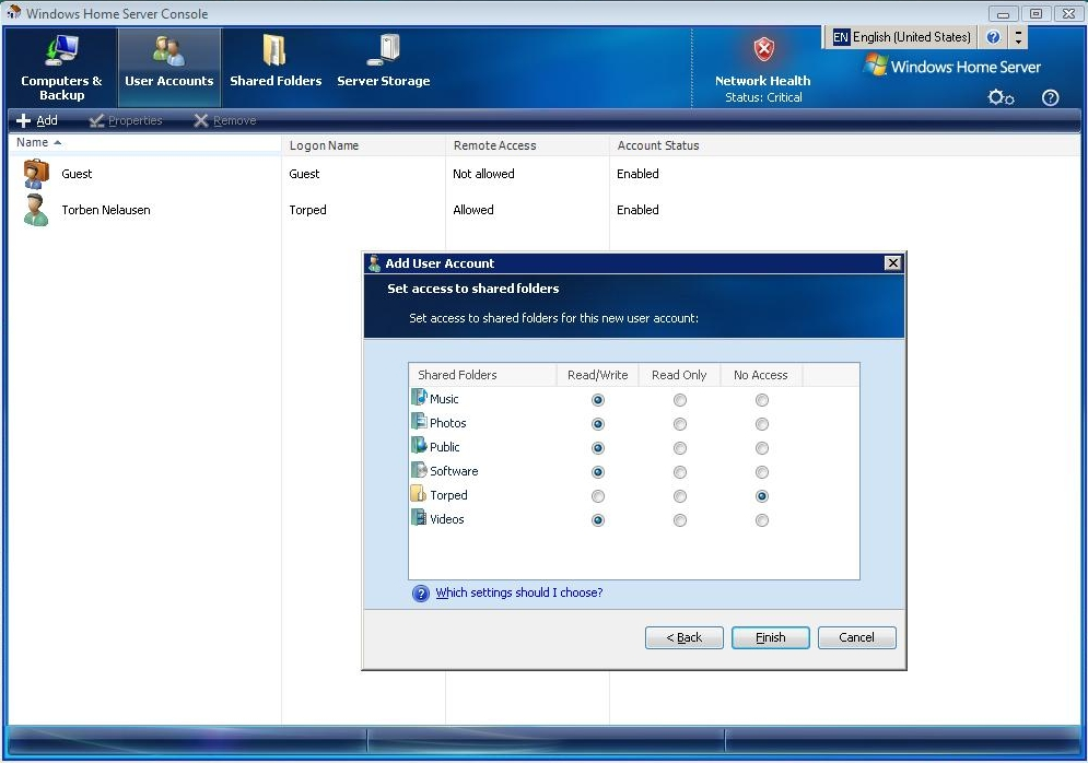 Her er vi ved at oprette en ny bruger på vores Windows Home Server. Som du kan se, får han fri læse/skrive-adgang til alle delte data på serveren - undtagen de, der ligger i den anden brugers private filmappe.