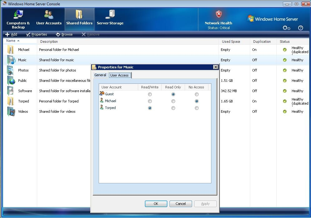 Forrest i billedet ser du, hvor nemt det er at vælge, hvilke rettigheder hver bruger har i forhold til den enkelte datafolder på en Windows Home Server-installation.