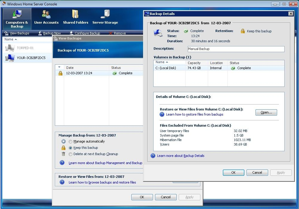 Nu har vi lige taget backup af en pc-installation, der rummede ca. 35 GB data. Heriblandt filer, mediedata og den komplette Windows Vista-installation. Alligevel rummer vores serverinstallation kun 7,7 GB sikkerhedskopierede data hvilket siger en del om, hvor effektivt data komprimeres.