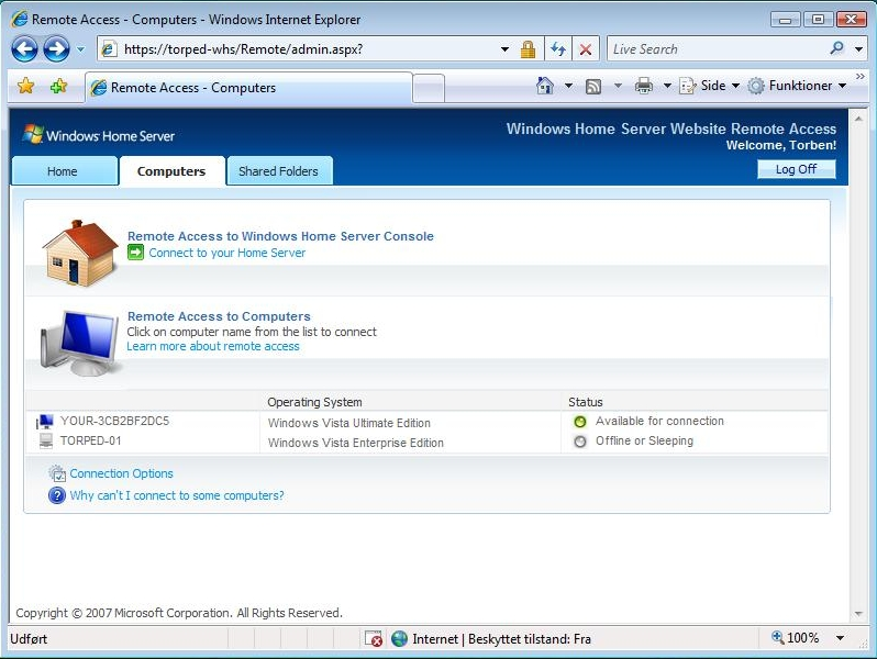 Du opnår fjernadgang via en ganske almindelig Internet Explorer-browser og kan herefter frit hente eller gemme filer på enten din Windows Home Server eller tilknyttede computere. Hvis du vel at mærke på forhånd har givet serveren og/eller den pågældende bruger de nødvendige rettigheder.