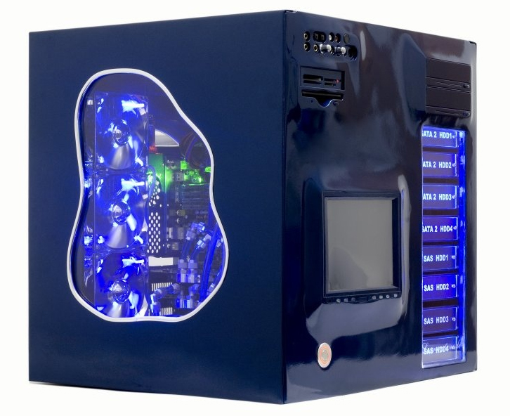 Den er specialfremstillet, og her er bestemt ikke sparet på komponenterne, der omfatter vandkøling, to gange Quad Core processorer, lynhurtige harddiske på i alt 4,3 terabyte, to monstergrafikkort af typen GeForce 8800GTX samt en spritny Blu-ray brænder!