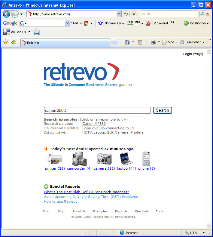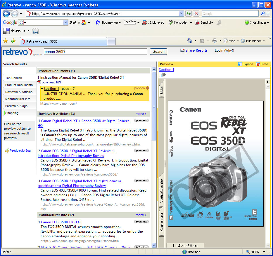 Søger du derfor på www.retrevo.com efter udstyr som for eksempel storsælgeren inden for digitale spejlreflekskameraer Canon EOS 350D, så er resultatet der med det samme. Samtidig er det pænt delt op i manualer, anmeldelser og producenternes websider med specifikationer.
