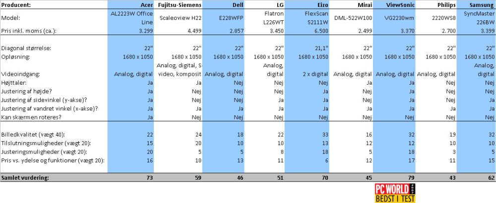 Derfor har vi bedt et større antal skærmproducenter om at sende PC World 22” skærme til priser i omegnen af 3.000-4.000 kroner, dog med rum for nødvendige afvigelser. Hele ni producenter stillede med produkter, og resultatet af denne – synes vi selv – vaskeægte stortest kan du læse på de følgende sider.