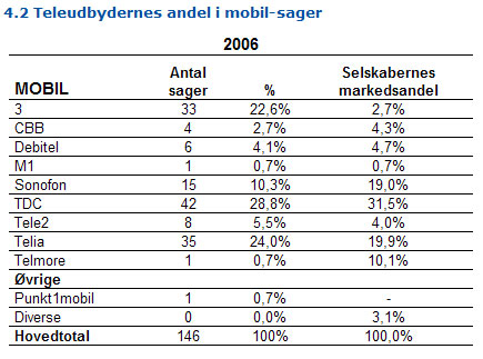 35 sager var fra Telia-kunder, 33 fra Mobilselskabet 3’s kunder og på fjerdepladsen ligger Sonofon med 15 klagesager.