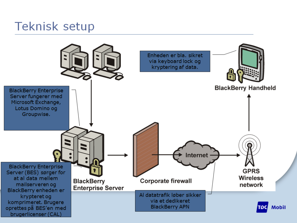 Det her er altså ikke en mobil, man typisk køber til sig selv - men derimod en brik i en samlet løsning, som store virksomheder kan investere mange hundrede tusinde kroner i. Fordi den tekniske opsætning og administration håndteres af virksomhedens it-afdeling, oplever brugeren Blackberry-mobilen som let og ligetil i forhold til gængse mobiltelefoner, der giver ham mere frihed - og dermed mere bøvl.