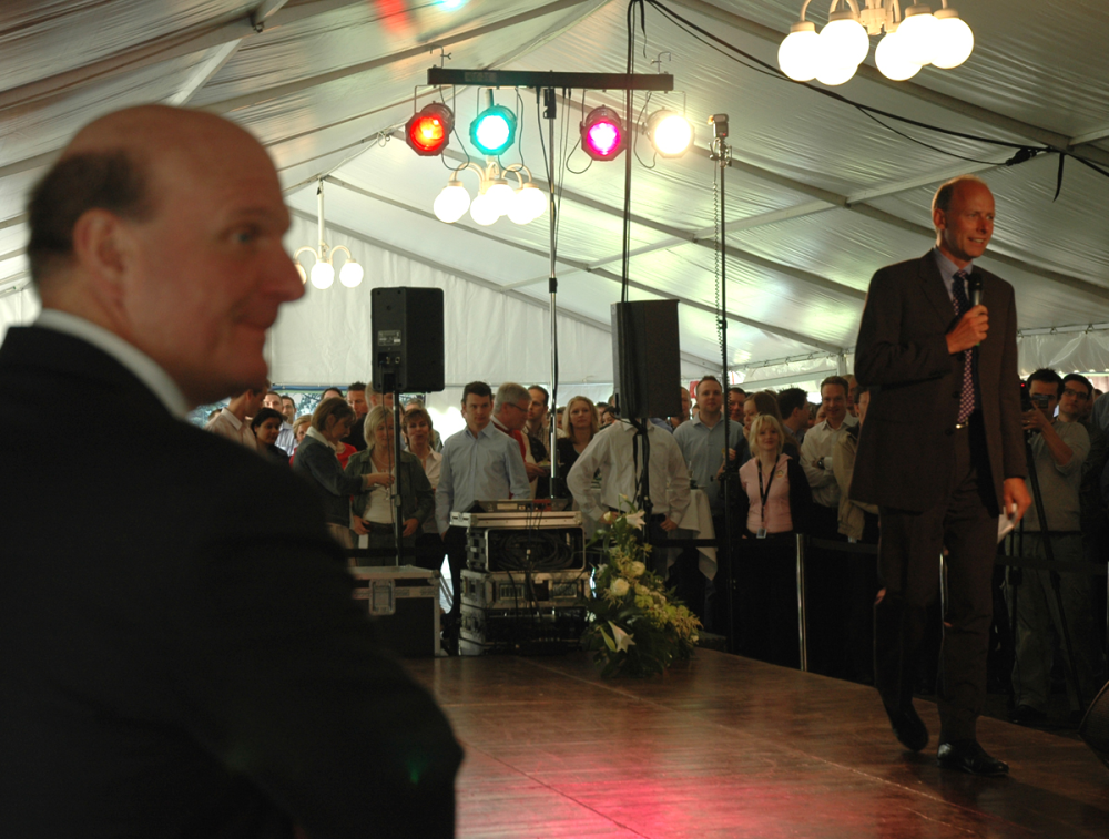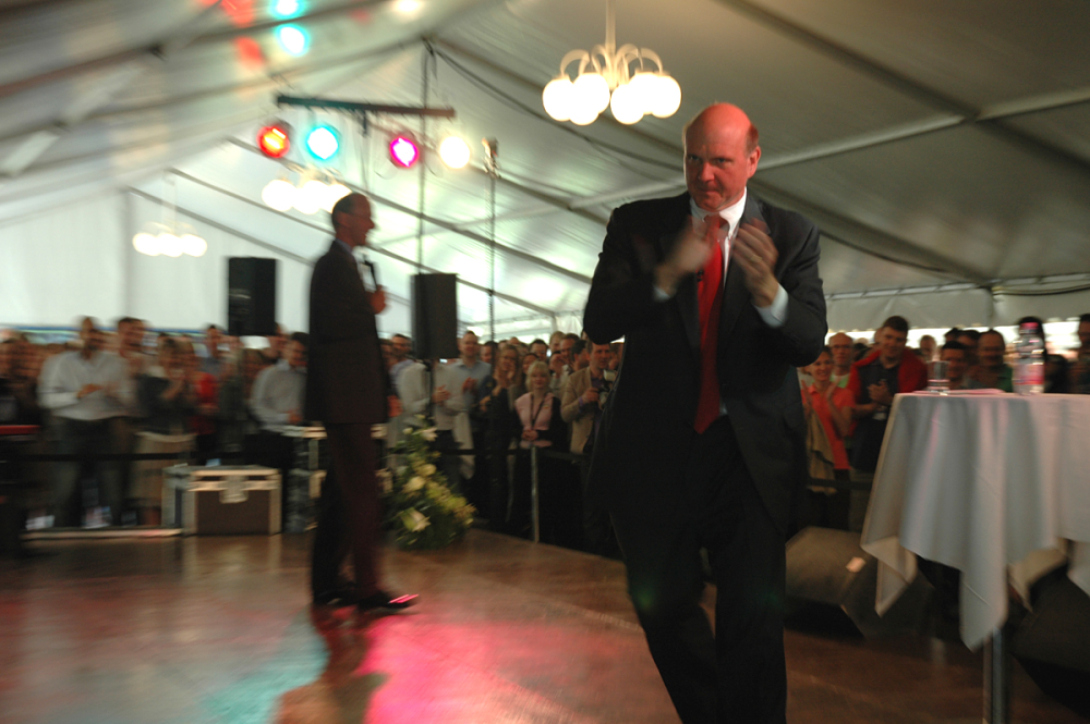 Steve Ballmer er også kommet ind i teltet. Han står i døråbningen, tæt på scenen. Et sort jakkesæt indrammer den korpulente mand, og han kigger stille op mod Klaus Holse Andersen. Ballmer er helt rolig. Ingen store armbevægelser.