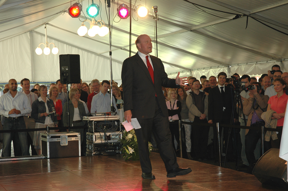 Manden på scenen er Steve Ballmer. Ikke et hvilket som helst brølehoved, men derimod topchef i Microsoft og i dag nummer 24 på listen over verdens rigeste mænd ifølge Forbes.com.