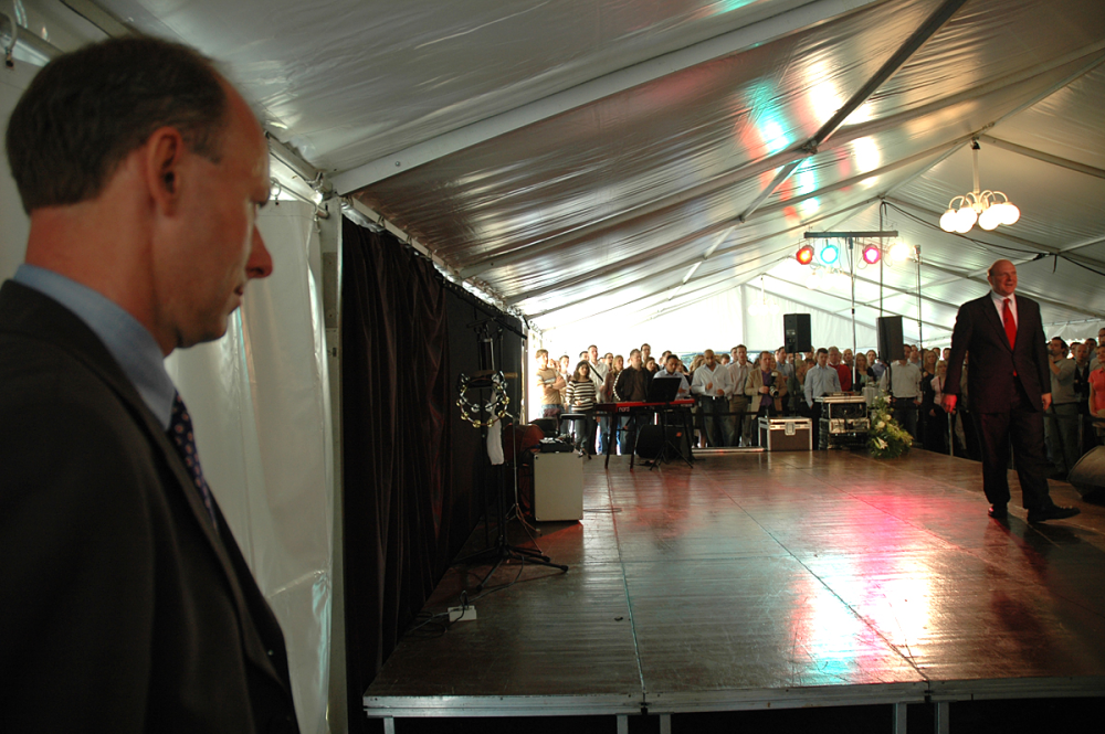 Et kæmpe hvidt telt er stillet op foran Microsofts danske base, og indenfor er en scene sat op. Før man får adgang til teltet, bliver ens medbragte tasker på ægte amerikanske vis undersøgt af bredskuldrede og kronragede sikkerhedsvagter.