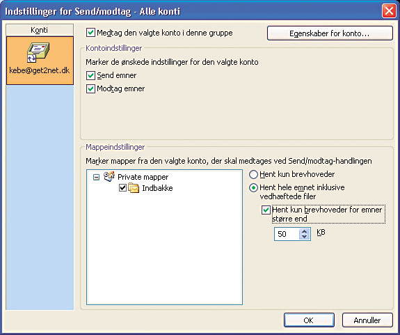 Klik nu på Send/modtag, vælg Alle konti og klik på Rediger. Marker Hent hele emnet inklusive vedhæftede filer (denne markering er sædvanligvis allerede sat) og marker derefter Hent kun brevhoveder for emner større end.