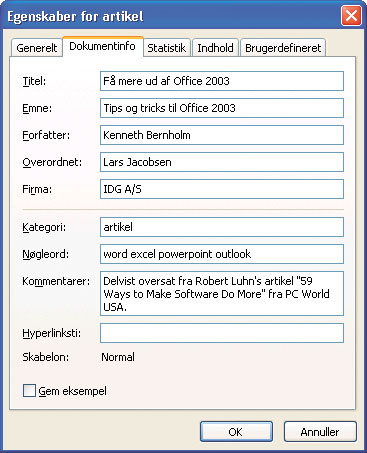 På fanebladet Dokumentinfo indtastes informationer som Titel, Emne, Nøgleord (eksempelvis “mål for 2007” eller “beskrivelse af netværk”), Kommentarer og så videre.